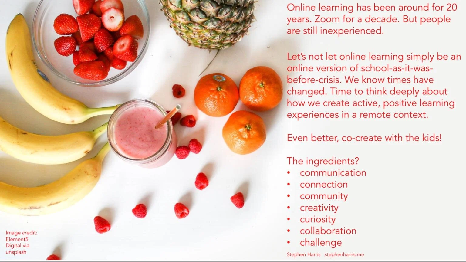 Here’s my list of ingredients for sustainable and positive remote learning experiences: